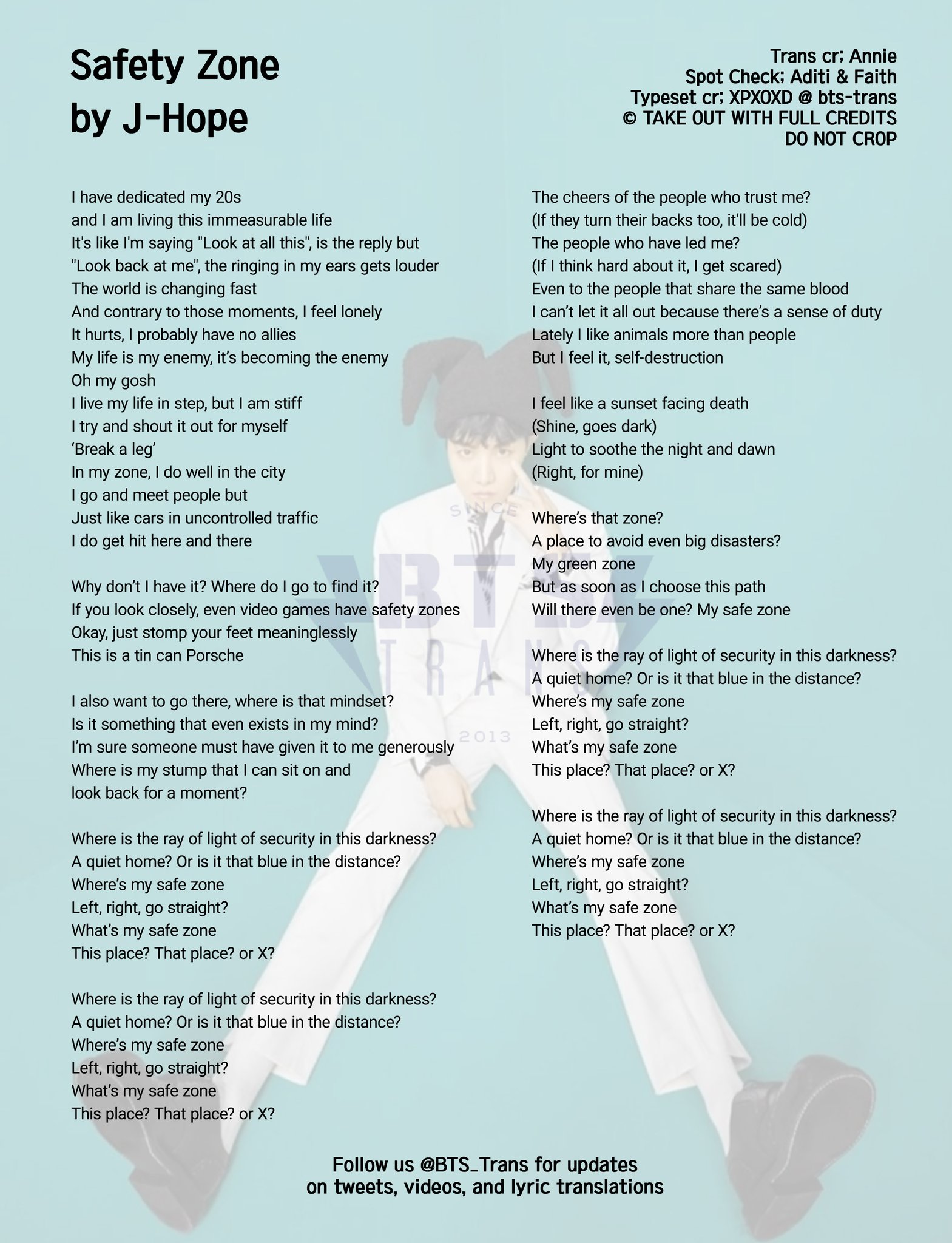 BTS Translations / Bangtansubs on Twitter "[KOR/ENG LYRICS] Safety Zone by JHope BTS_twt BTS Safety Zone Jhope Credits 큰 재해도 피해 가는 나의 green zone but 이 길을 선택하는 순간 있기는 할까? [intro] / [?] / where's my safe zone? safety zone lyrics & meanings: 어둠 속 안도의 한줄기 빛은 어디일까? I have dedicated my 20s / and i am living this. Safety Zone Jhope Credits.